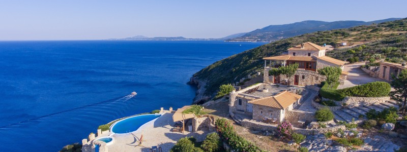 Villa Deep Blue stands majestically on the cliff and offers breathtaking panoramic views. The villa was built according to the architectural Zakynthian tradition with natural stone and is beautifully decorated. It has 4 spacious en-suite bedrooms, a private infinity pool with hydro-massage area and also has direct access to the sea. It is a perfect choice for a family or a group of friends (capacity 8 to 9 people).